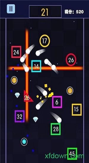 玩家需借助小球撞击带数字的方块以获取高额分数;这款游戏操作简便有趣,属于大众休闲类游戏;玩家按住屏幕并水平拖动来瞄准砖块,瞄准完成后松开手指就能发射小球。