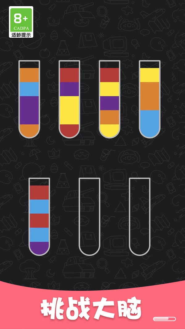 完美大脑游戏是一款以颜色分离为核心玩法的休闲益智游戏,玩家需要把混合颜色的液体倒进试管里,借助倒置、分层等操作让相同颜色的液体聚集在一起。游戏规则很容易理解,玩家只需点击试管就能转移液体,但要遵守同色叠加和空间匹配的规则。看似简单的操作背后,藏着拓扑排序与空间推理的硬核逻辑,简直可以说是流体版本的华容道。