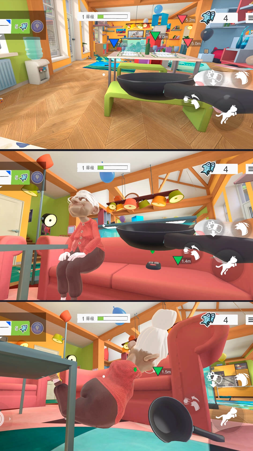 体验猫咪本能的高空跃击、拍打物品等动作,通过剐蹭沙发、掀翻餐具等行为制造混乱,躲避老奶奶的围追堵截,享受刺激的攻防博弈;
