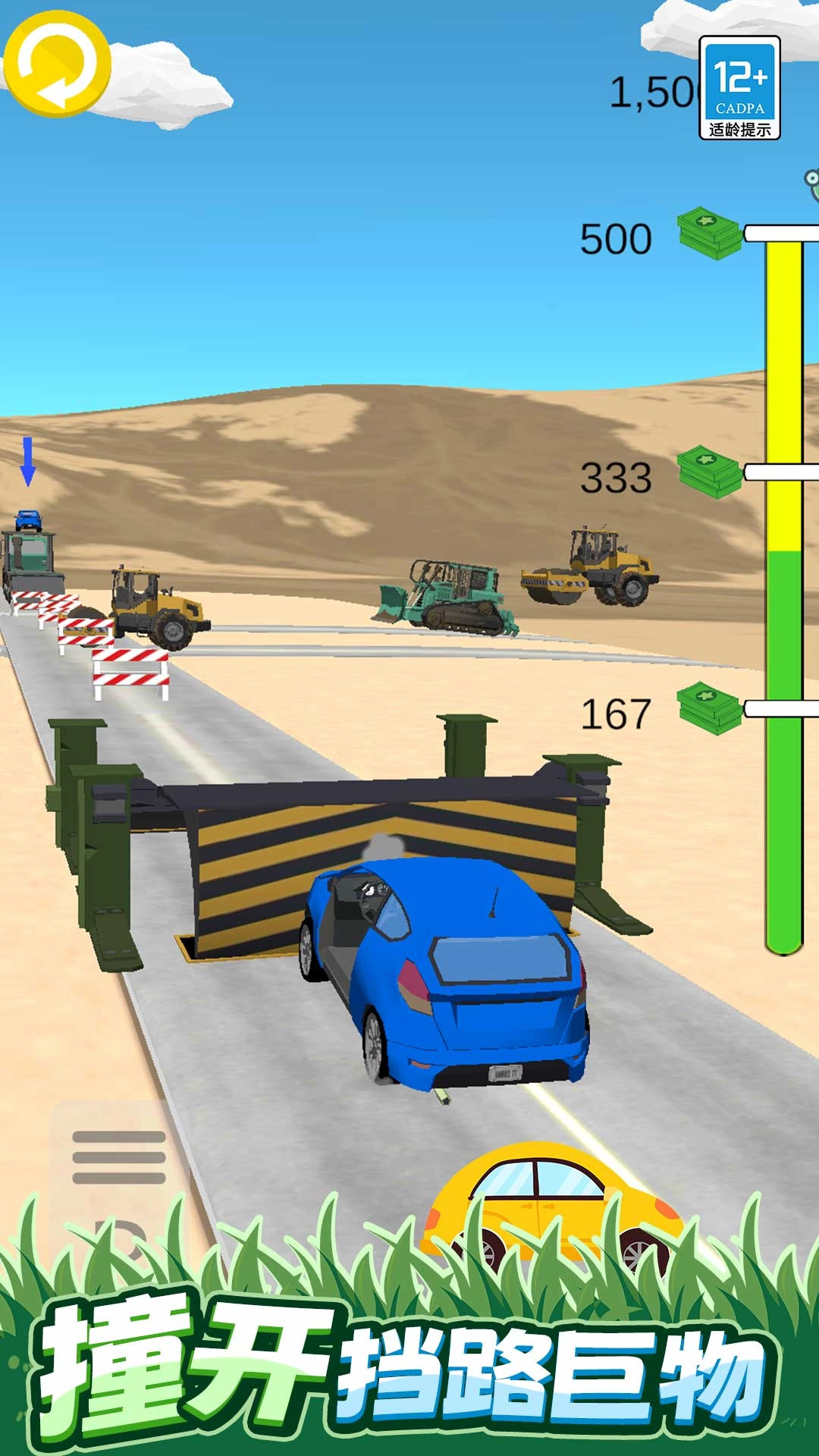 3、玩家需时刻保持警惕,通过及时松开刹车、调整行驶方向来躲避,稍有不慎就会碰撞导致游戏失败。