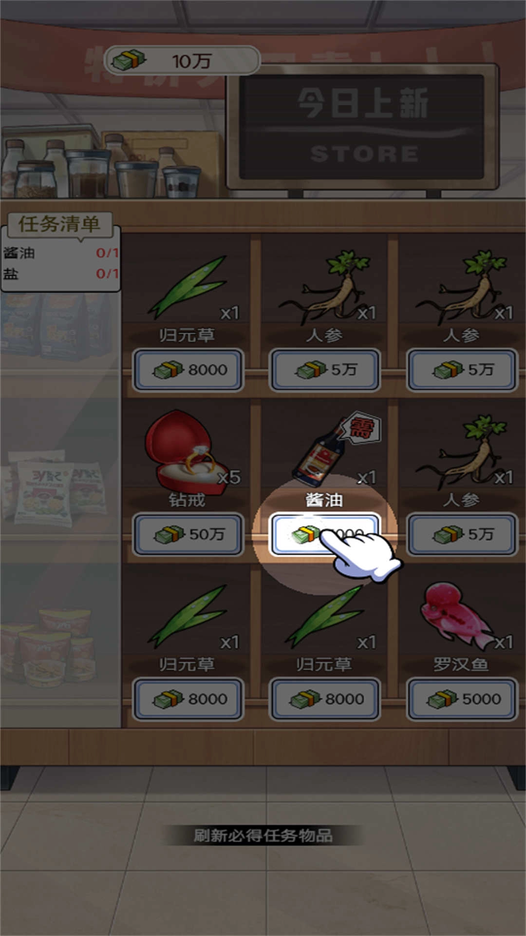 完成购物任务清单里的各项任务,借助刷新机制来获取需要的物品,逐步积累资源。