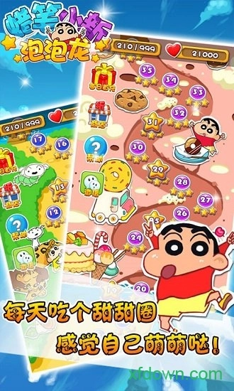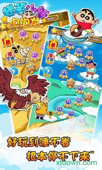 经典的泡泡龙消除游戏与蜡笔小新动画的融合极具吸引力,十分引人注目。