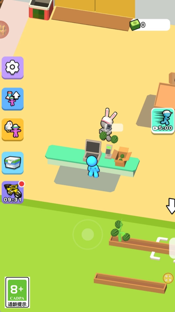 点击左侧的图标,就能招募员工、升级机器,从而提升收银和上货的效率,让赚钱速度变得更快。