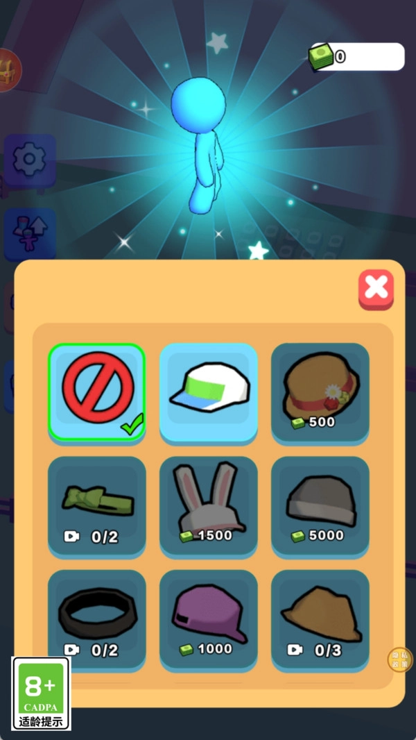 进入装扮界面后,使用金币购买帽子之类的饰品,为小人更换装扮,对角色外观进行个性化定制。