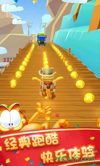 游戏的操作十分简便,玩家只需向上滑动屏幕,就能操控加菲猫跑动或跳跃;遇到低矮障碍时,向下滑动屏幕,即可让加菲猫向下滑行以躲避障碍。在躲避障碍的过程中,玩家还需尽可能收集沿途的金币来培养自己的角色。这使得玩家在体验跑酷游戏乐趣的同时,还能感受到更多的新鲜感与耐玩度。