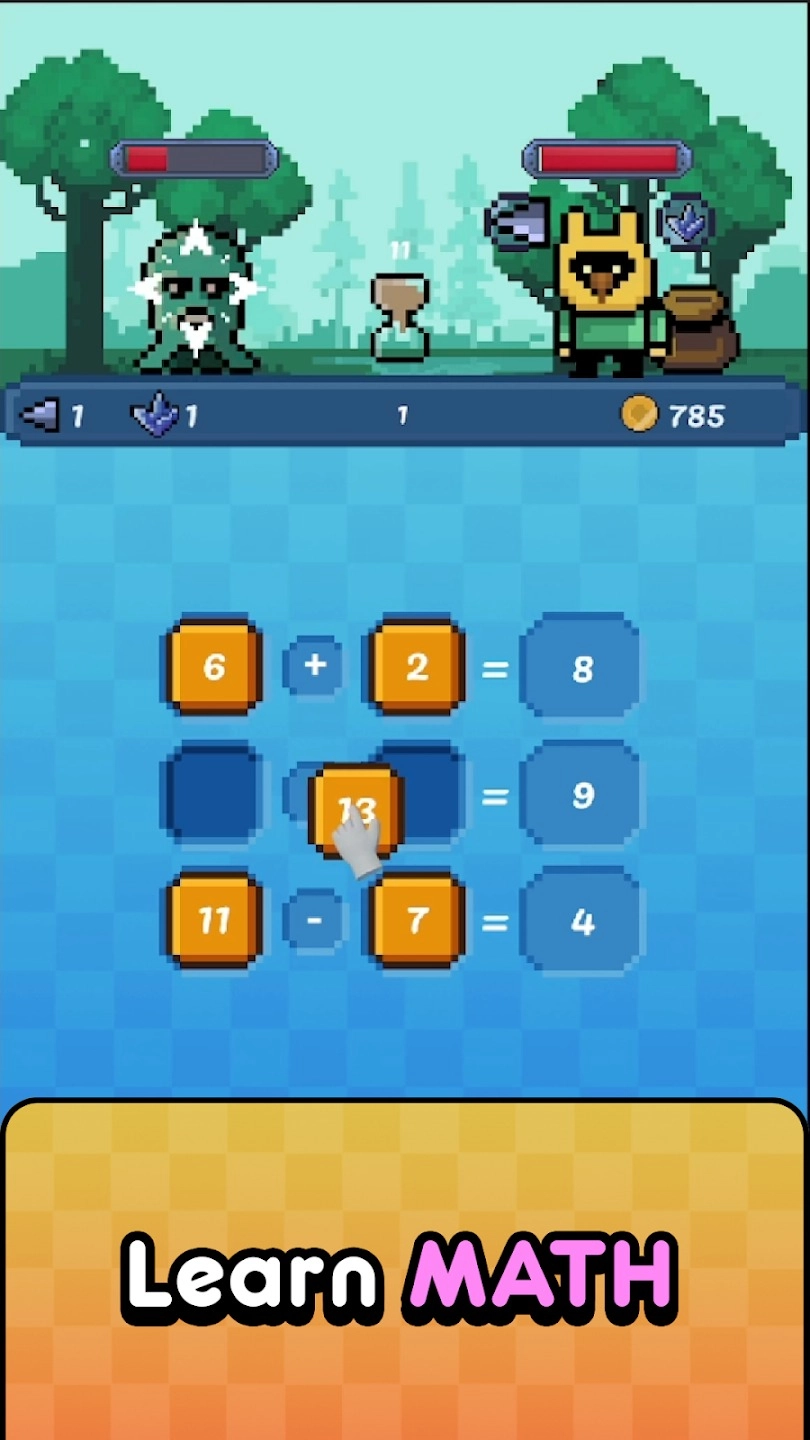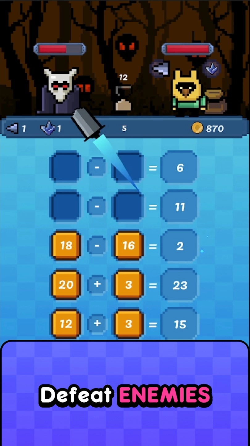 玩家需要移动屏幕上的数字方块,拼凑出正确的数学等式,该等式的计算结果数值就是对敌人造成的伤害值。