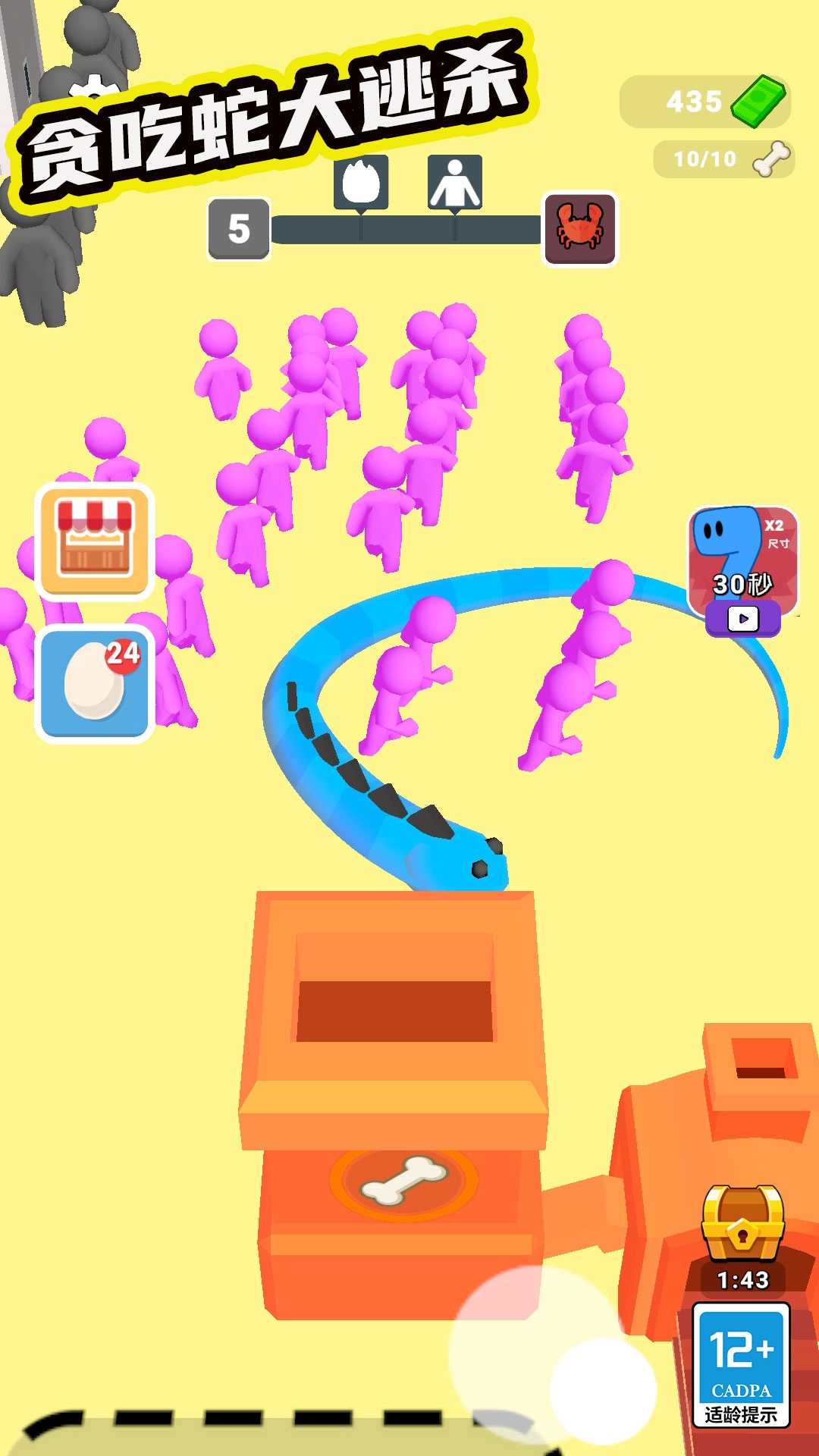 贪吃蛇大逃杀是一款趣味十足的闯关游戏,玩家在游戏里能操控贪吃蛇肆意吞噬各类生物。每个场景中都会出现大量人类,玩家可利用这些人类让贪吃蛇快速进食,使其体型迅速增大,进而提升贪吃蛇的吞噬能力与移动速度,更轻松地完成吞噬挑战。在闯关时,玩家需要留意各种陷阱,同时还要躲避人类的武器攻击,尽情享受自由吞噬带来的乐趣。