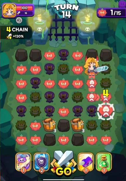 点击匹配3个及以上的符文,就能发动攻击并降低敌人的血量。2、借助武器技能,搭配三消的顺序,打出伤害更高的连锁技能。3、战斗获胜后收集到的素材,可用来烹饪食物或者锻造装备。