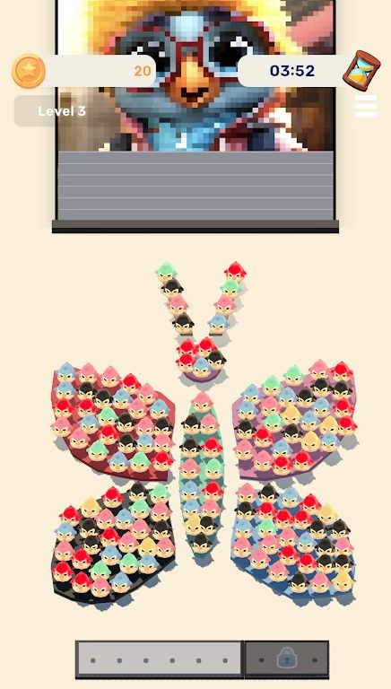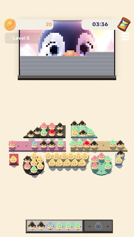 企鹅分类是一款既益智又有趣的闯关游戏。进入游戏后,你会发现屏幕下方的空间里站着各种颜色的企鹅,而屏幕上方则是一幅尚未完成的填色画。玩家需要通过匹配消除不同颜色的企鹅来填充这幅填色画,这种创意玩法十分有趣,不仅要求玩家思考如何消除彩色企鹅,还需要按照要求完成填色画的创作。游戏拥有丰富的主题关卡,难度设置富有挑战性,能让玩家在思考的过程中收获满满的欢乐!