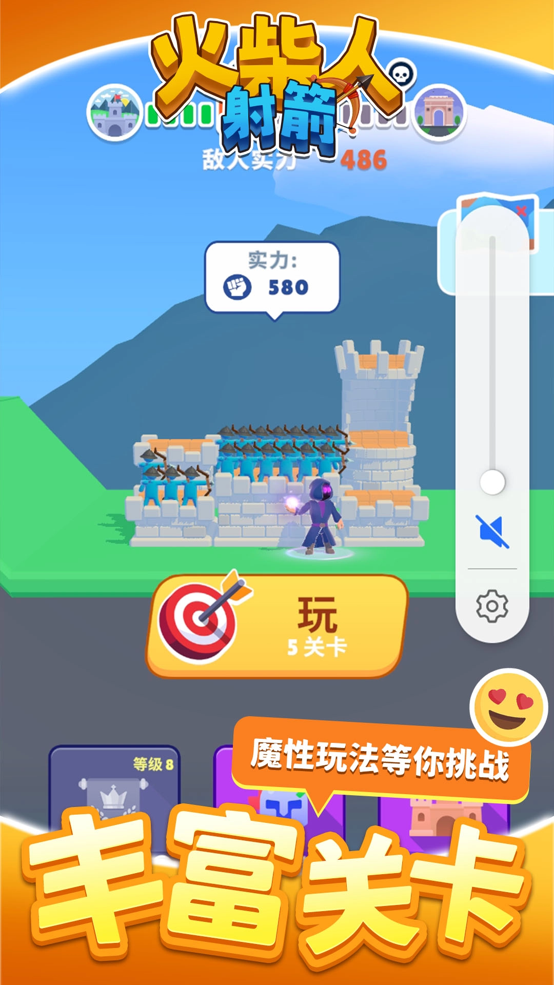 火柴人射箭是一款超有趣的休闲对战游戏,你可以操控火柴人,找准角度射出弓箭,击败敌人获取胜利。用赢得的收益来壮大你的军队、提升整体实力,去挑战更强大的对手。游戏拥有丰富的关卡和魔性的玩法,简约的画风搭配上刺激的对战,只需要一根手指就能畅快游玩,轻松又让人上头,快来成为射箭大佬吧!