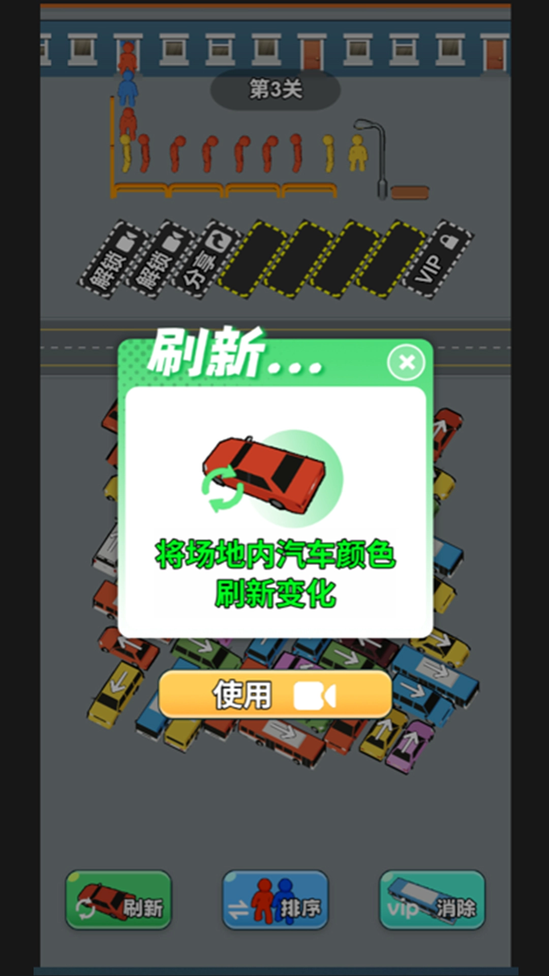 卡关时使用道具,刷新切换车辆颜色,通过排序重新安排乘客、消除车辆并将其送入VIP车位来解决难题。
