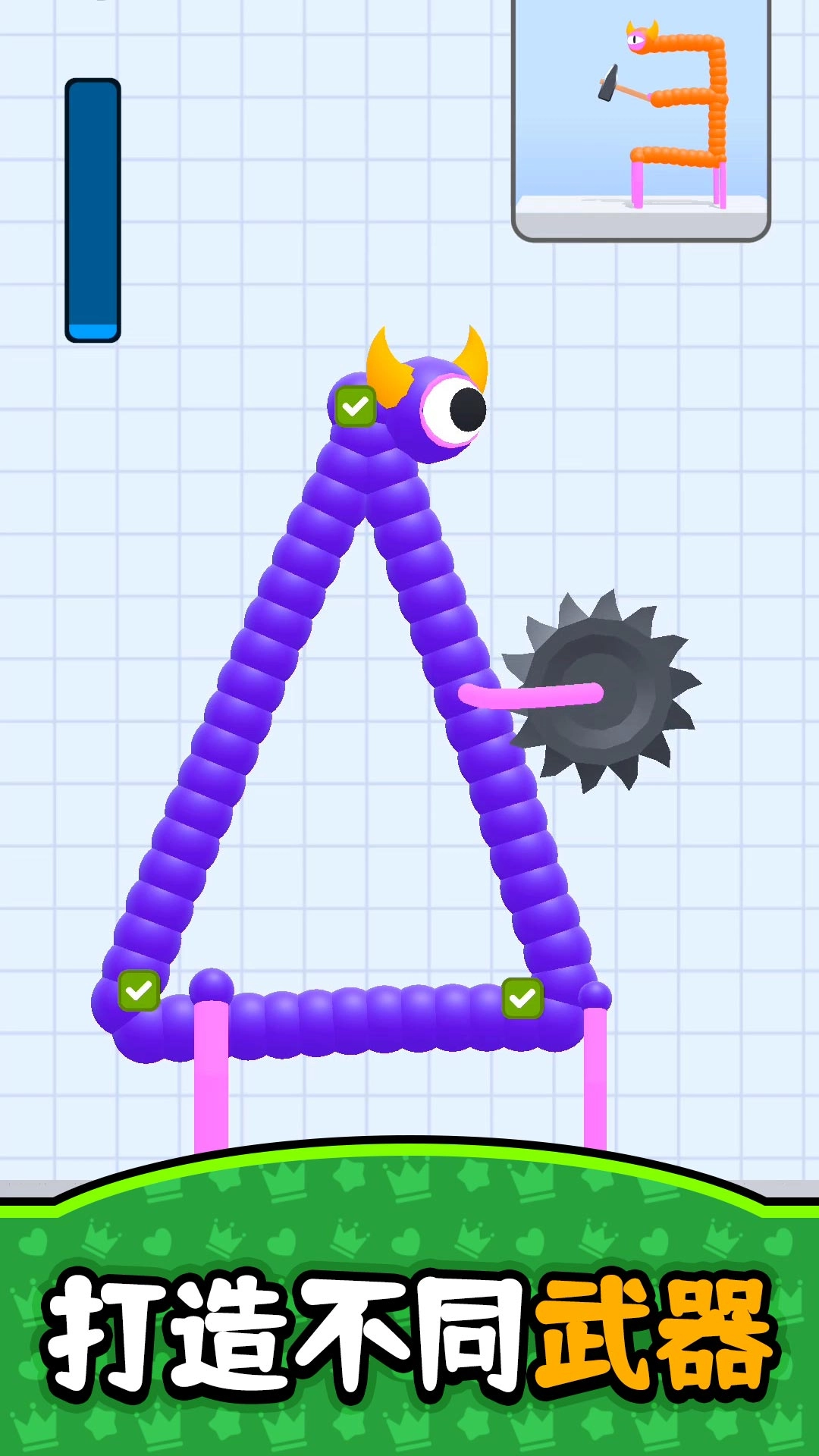 我们提供锤子、弓箭、盾牌等30余种可拼接的武器模块,将不同部位进行安装会对攻击范围与招式产生影响。