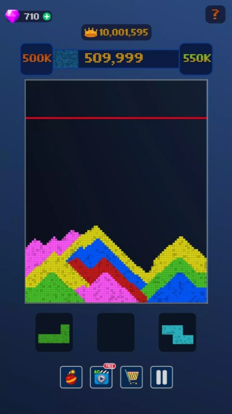 通过移动和旋转沙块,让相同颜色的沙粒堆积形成完整的水平线,就能消除并得分。