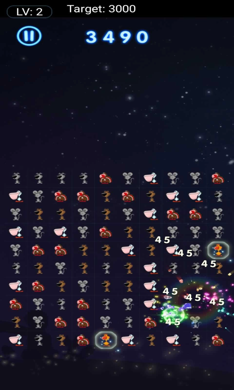 观察全局布局 → 优先消除下方的动物,以此创造更多可消除的机会