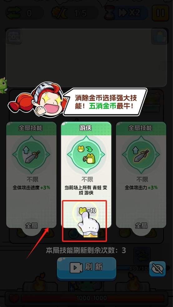 点击下方的技能按钮,消耗金币选择强大技能,发动强力攻击。