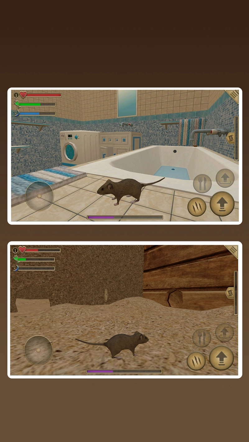 通过操控虚拟摇杆来控制老鼠移动,让它在各种不同的场景里进行探索,同时收集食物、水源以及筑巢所需的材料。
