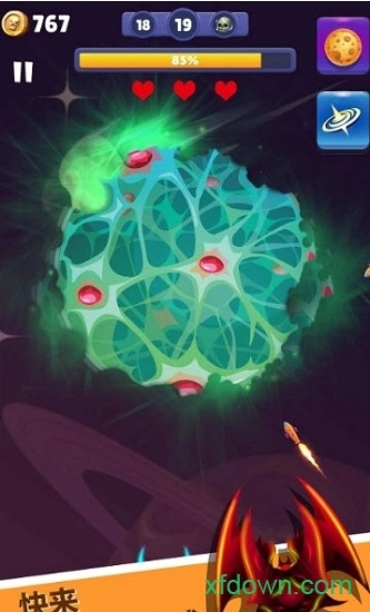 2、操控战舰进行射击,糖果构成的星球十分易碎,用子弹将其打成筛子,以此宣泄心中的怒火。