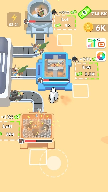 这款经营模拟游戏以垃圾回收为题材,主题颇具意义,能让玩家在游戏过程中认识到环保的重要性;2.玩家需通过合理操作,把垃圾投放到对应的履带上完成分类,以此提升回收效率并增加利润。