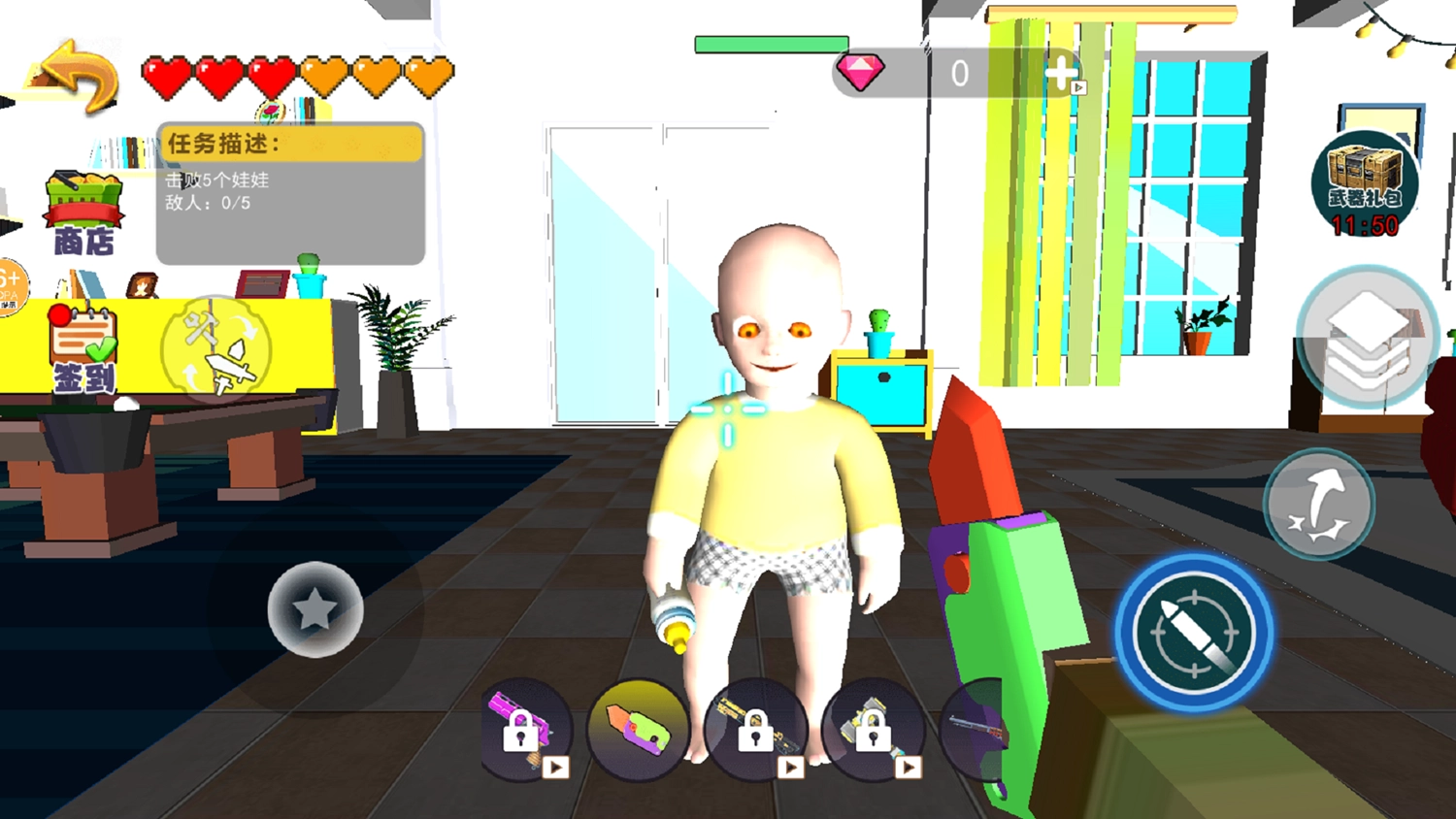 在场景里搜寻爱捣乱的黄衣宝宝,借助挑选的武器巧妙应对,避免它搞破坏。