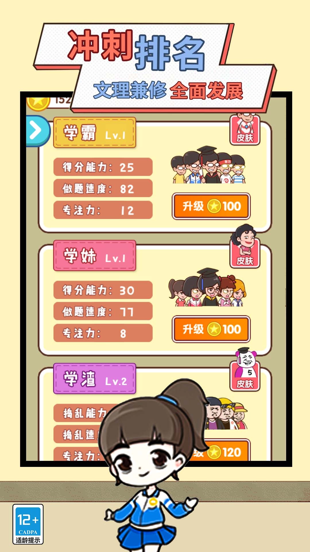 玩家能够操控学霸、学妹、学渣等不同类型的角色,每个角色都具备得分能力、做题速度、专注力等属性。