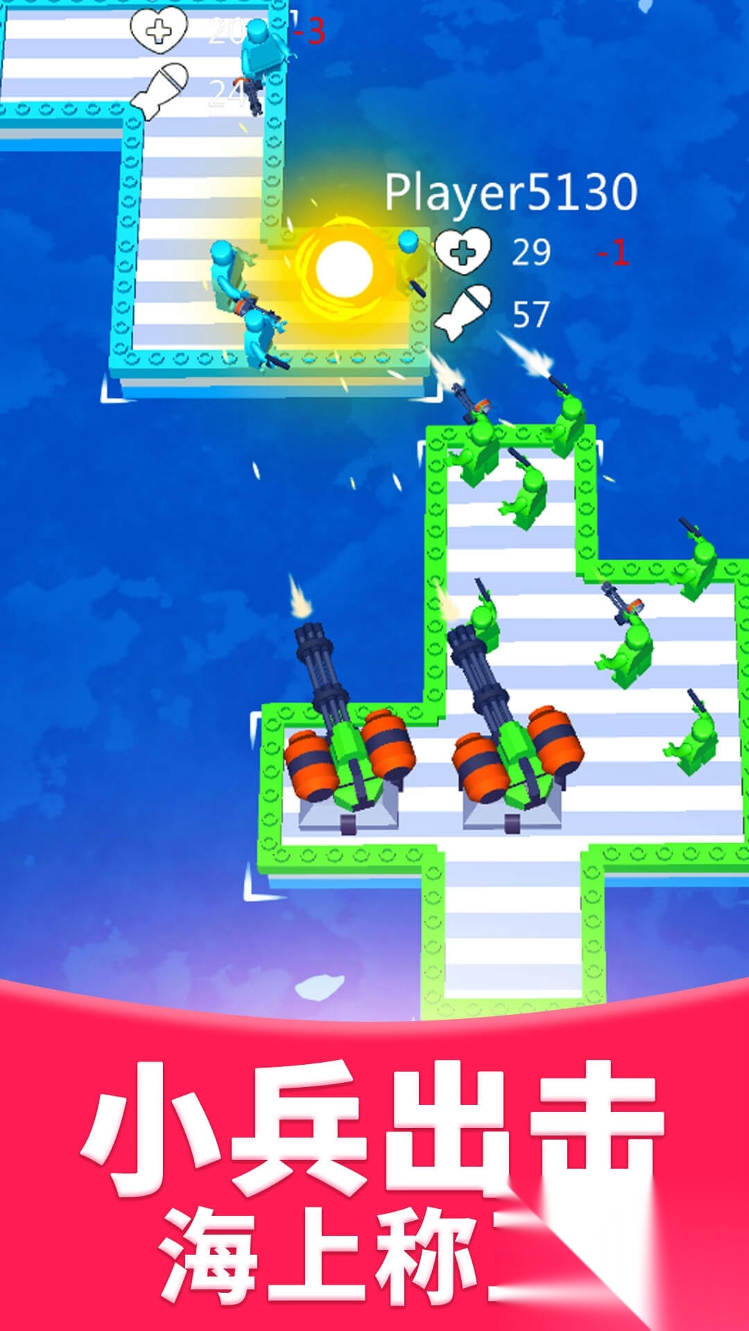 指挥士兵向邻近木筏发起进攻,通过实时操作击溃守军,胜利后即可把敌方木筏与己方木筏拼接起来,达成木筏面积与兵力的同步提升。