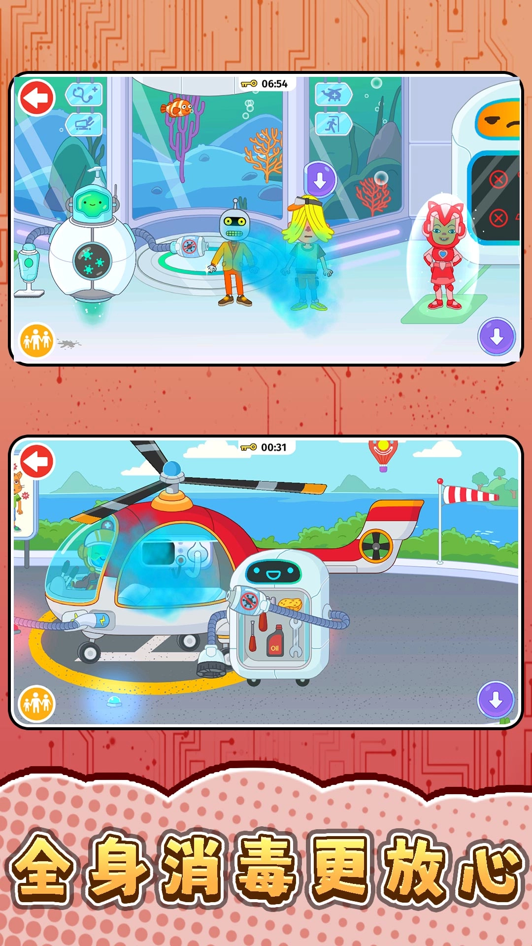 进入消毒场景后,点击角色与机器人,使用消毒道具进行清理,完成后可获得消毒认证,进而解锁新功能。