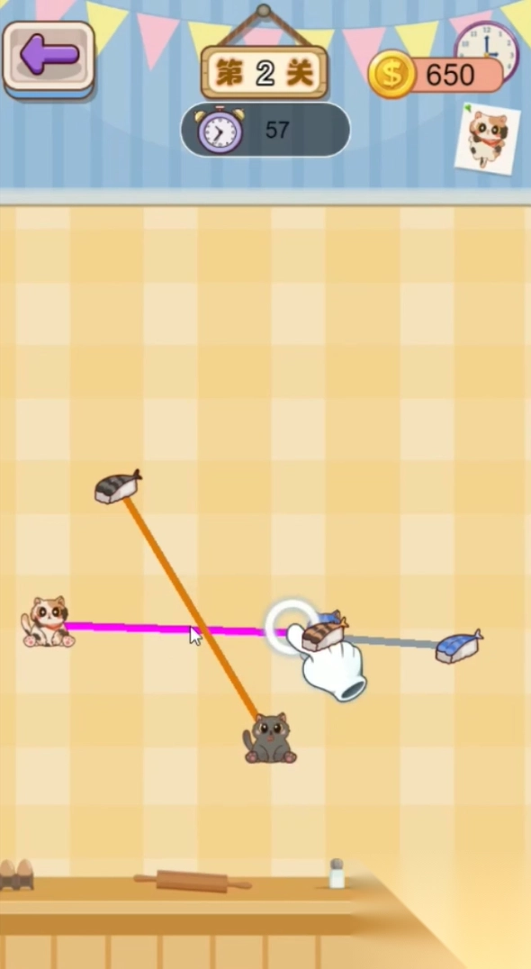 判断需求:每只猫咪的头顶会出现特定的颜色或图案标识,这对应着它此刻想要享用的寿司种类,像橙色的三文鱼寿司、粉色的虾寿司、绿色的牛油果寿司都在其中。