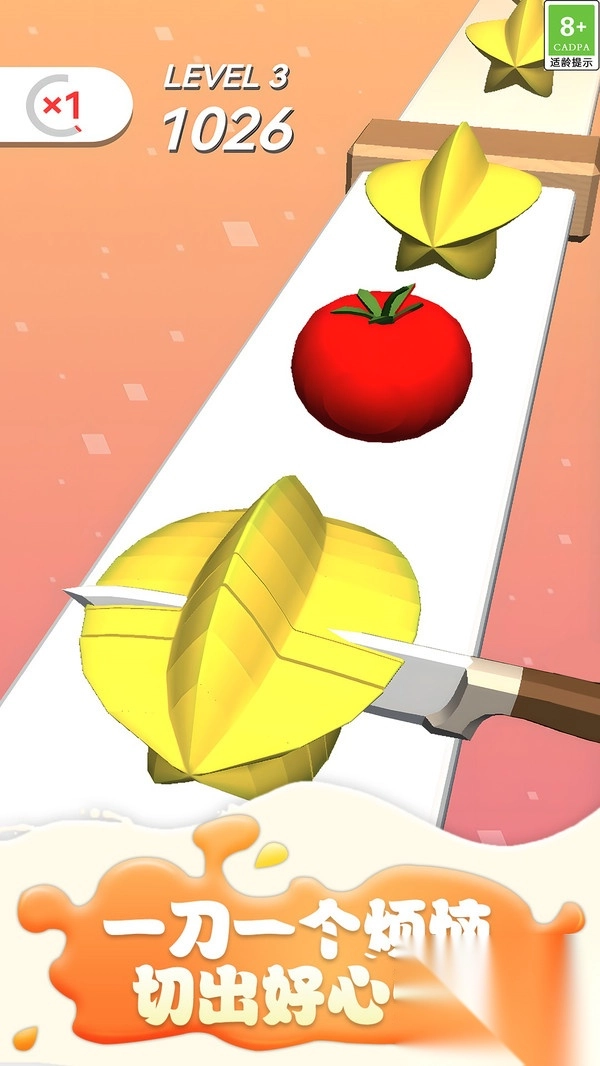 游戏的操作十分简单易懂,玩家仅需滑动屏幕,就能操控飞刀在跑道上切割水果。