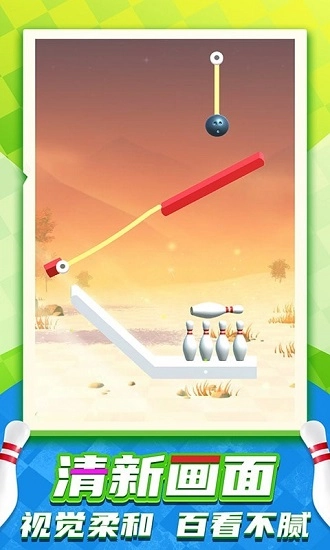 切割绳子,让保龄球击打所有的保龄球瓶至落地,击落所有的保龄球瓶即可完成任务。