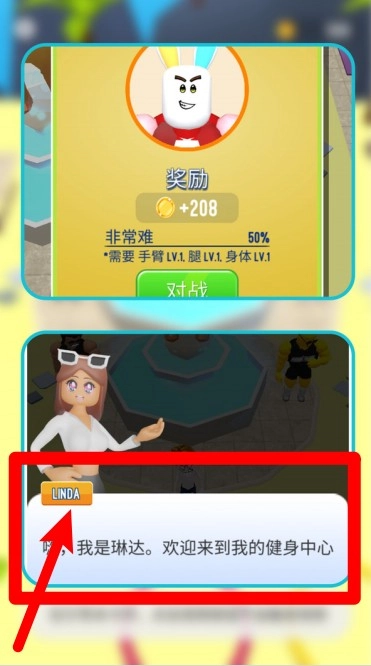 2. 和健身中心的Linda交流,知晓健身任务与挑战的具体内容,开启你的健身冒险之旅。