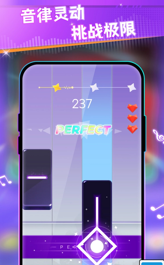 通过点击、长按、滑动三种基础操作演奏下落音符,完美击打触发连击。 包含经典演奏、闯关挑战、竞速模式等6种玩法,支持自定义谱面创作。 特殊镜像/隐形/变速模式为高手提供极限挑战。
