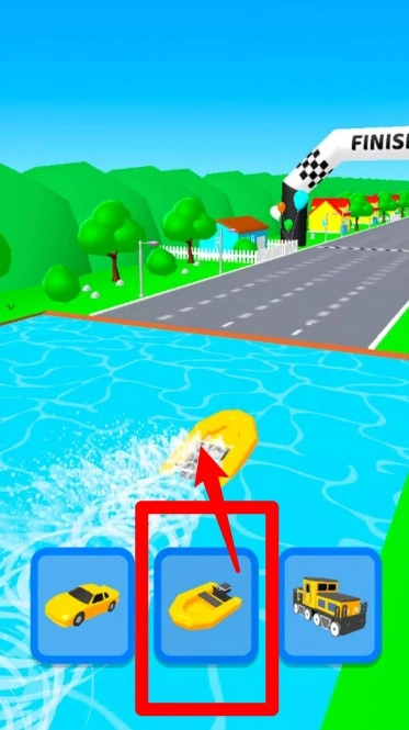 3.识别水面并切换船形态:进入蓝色水面区域后,需立即变形为船只形态,若保持其他形态(如车辆或火车形态),将直接陷入水中无法移动。