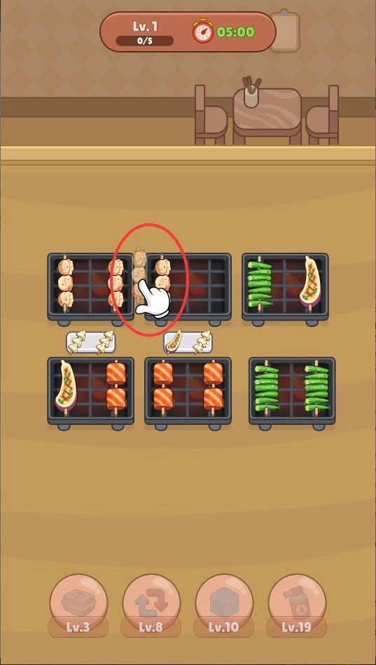 烧烤排序游戏里各种烤串都齐全,你只要把它们归类摆好就行,客人看了一目了然。点几下就能上手,操作特别简单,还得留意烤串有没有熟透。玩着玩着就容易上瘾,乐趣满满,快来体验一下!这款烤串消消乐,用来打发时间再合适不过,男女老少都能玩得开心。