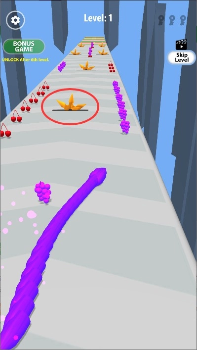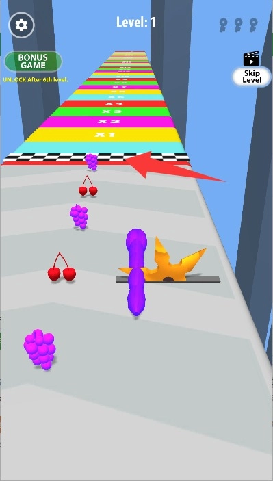进入游戏后直接开启赛道挑战,通过手指在屏幕上左右滑动来操控蛇形角色的移动方向。