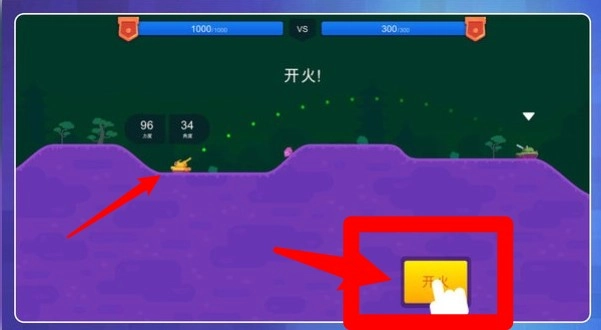点击“开火”按钮发射炮弹,炮弹的弹道抛物线由力量和角度共同决定。