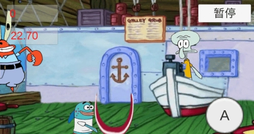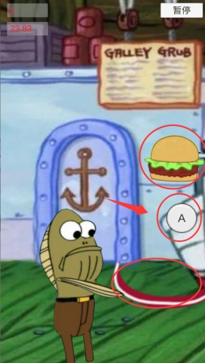 2、当屏幕上方随机掉落汉堡图标时,需快速点击虚拟按键“A”来控制角色举起双臂。只要角色成功触碰到食物,就会判定为有效接取。