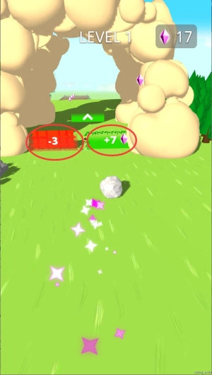 1、点击屏幕释放巨石使其开始滚动,通过左右滑动操作来控制它的前进方向,收集沿途的绿色宝石可以增加体积分数。