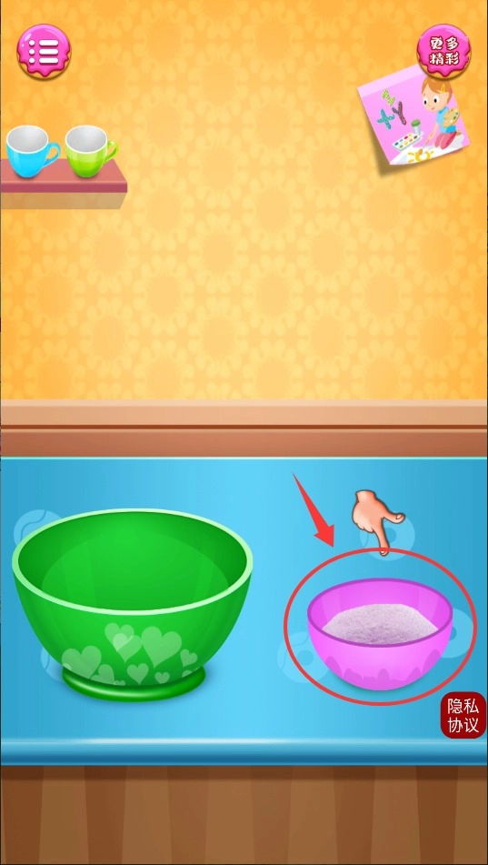 2、通过手指滑动控制食材移动,将面粉、糖霜等材料精准放入容器,感受制作甜点的趣味过程。