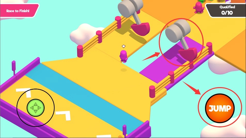 3、用右手操控跳跃键来控制角色,小心避开障碍物,通过简单的练习掌握相关技巧,在轻松愉快的氛围里快速成长并不断进阶。