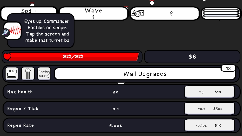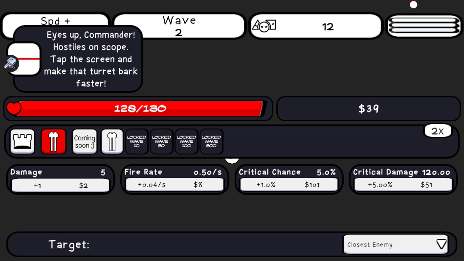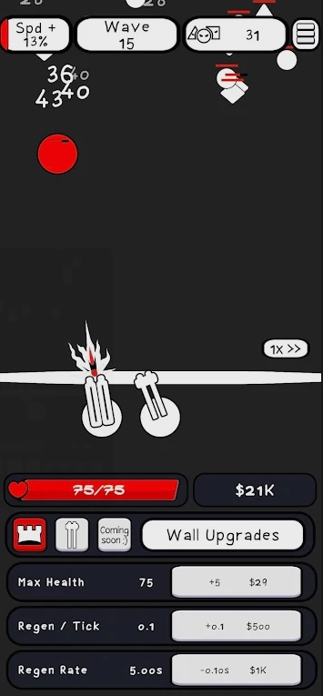玩家能够在防守红线的后方布置各类武器,每一种武器都可以利用金币来提升攻击力、射速与射程,合理地分配资源是顺利通关的核心要点。