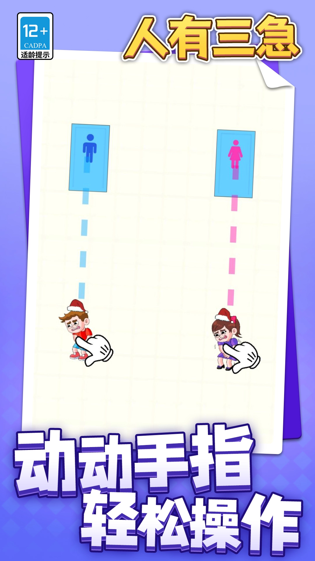 《人有三急》是一款益智连线类闯关游戏。游戏名中的“人有三急”在这里有了新的含义——我们需要帮助关卡里的角色找到对应的厕所。需要注意的是,角色和厕所的性别必须一致,而且不同角色的路线不能交叉重叠。你要巧妙地画出连线,让角色和对应的厕所连接起来,完成关卡任务就能获得奖励!益智的玩法搭配有趣的主题,让这款连线闯关游戏极具吸引力,玩起来十分上头。每个关卡都有多种不同的解法,所以玩家可以反复挑战,尝试找出所有可能的答案。