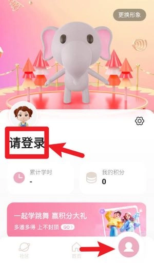 1、启动大象起舞应用后,找到页面上的“请登录”按钮并点击,登录个人账号以便记录学习数据。