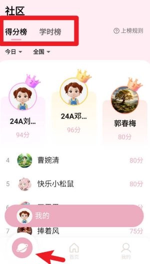3、点击下方的“社区”栏目,就能查看全国排行榜,知晓自己的得分和学时排名情况,从而增强参与的动力。