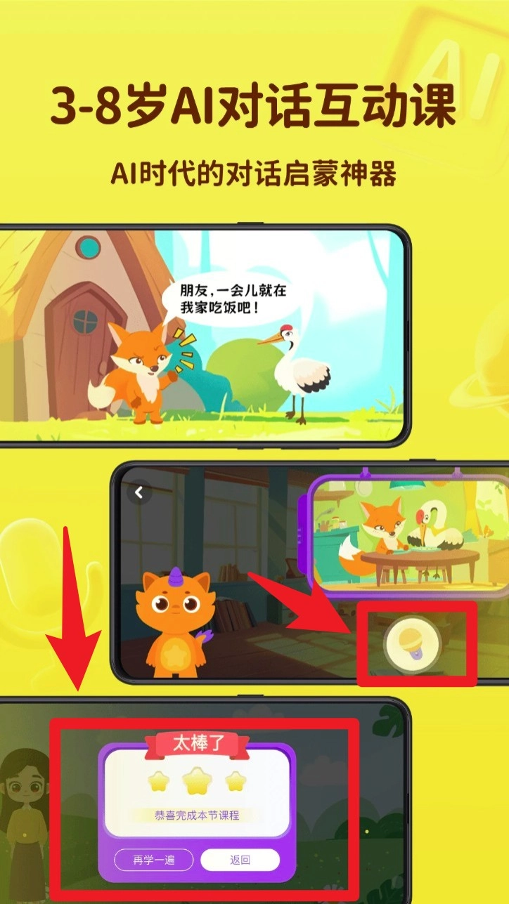 4. 进入互动课程界面后,按照提示开展语音对话,完成互动环节后,系统将呈现评分与奖励,以此提升学习的积极性。
