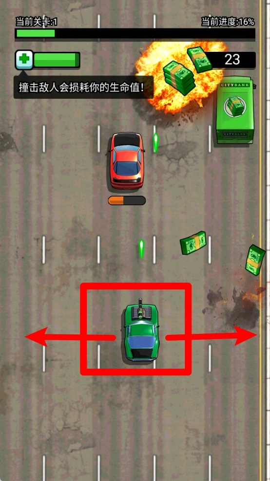 2.控制飞车左右移动,躲避敌人和障碍物的同时自动开火击杀敌人,撞击会直接扣血要注意操作节奏。