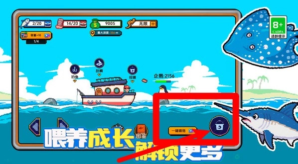 1. 点击界面右下角的一键收鱼按钮,就能快速完成收获结算,对于喜欢挂机刷资源的玩家来说非常合适,不用手动操作就能加速游戏内的成长进度。