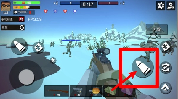 1. 点击右侧的大子弹图标能够手动进行开火操作,结合瞄准功能可以对远处的敌人实施精准射击,从而提高命中率与击杀效率。