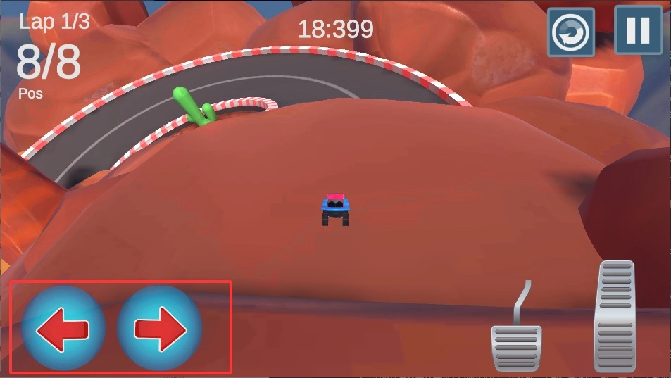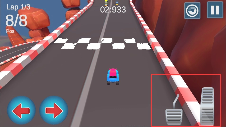 2、右手按油门键让小车跑起来,遇到弯道要记得踩刹车减速,不然容易冲出跑道。