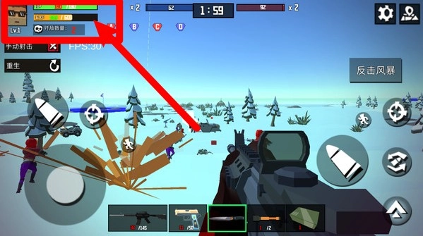 1. 画面中央呈现玩家的第一人称视角,玩家手持突击步枪参与战斗,左上角展示着角色的生命值、等级以及击杀数量。