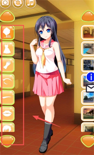 进入游戏后,你会看到一位二次元女孩的立绘,身处室内场景之中。你可以点击左侧的树状图标或裙子图标为女孩更换装扮,也能点击右侧的九宫格相册图标与信封图标,浏览不同的图片和信息。